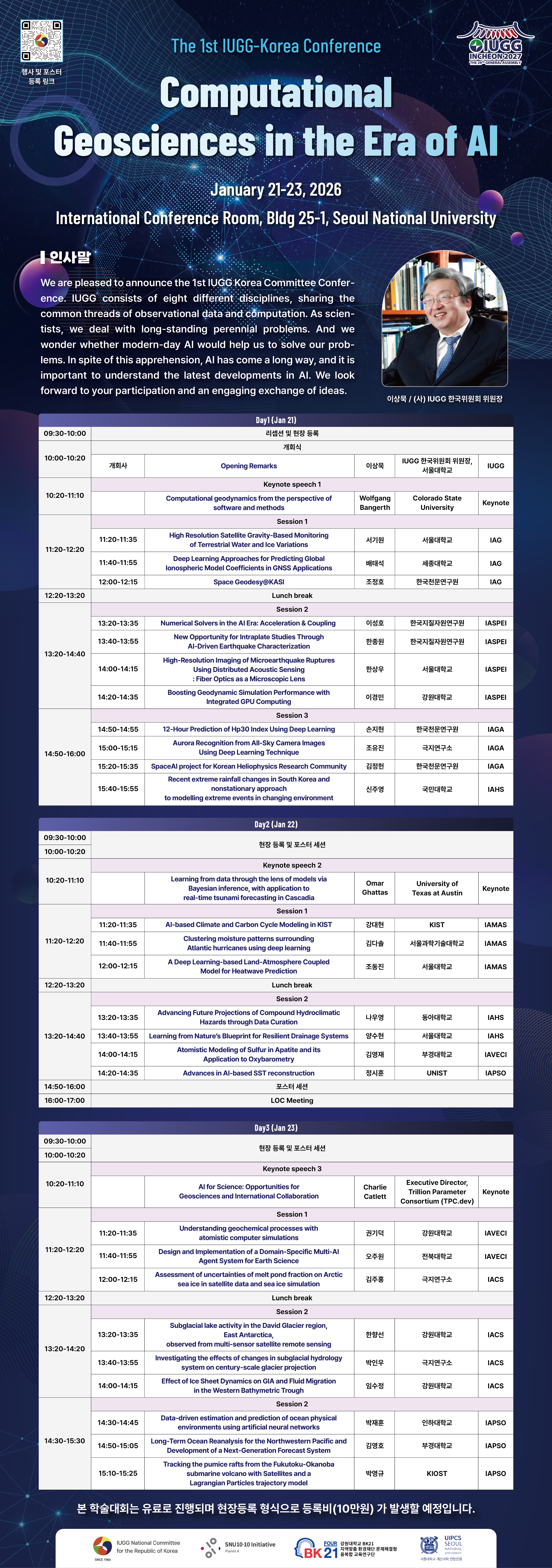 2026년 1월 21일(수)부터 23일(금)까지, 서울대학교 관악캠퍼스 25-1동 국제회의실에서 1st IUGG-KOREA Conference를 개최하고자 합니다.